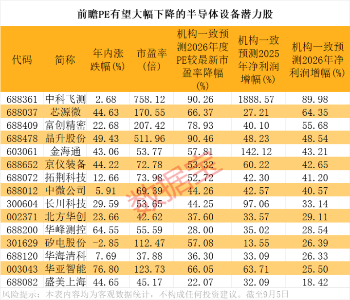 根据机构一致预测,前瞻市盈率有望持续下降的公司有16家(即2026年度预测PE低于2025年度预测PE,且2025年度预测PE低于最新滚动市盈率)。这16家公司获机构一致预测2025年、2026年净利润增幅均有望超过10%,且2026年度预测PE较最新滚动市盈率降幅均有望超过20%,其中晶升股份、中科飞测、富创精密降幅均有望超过75%。